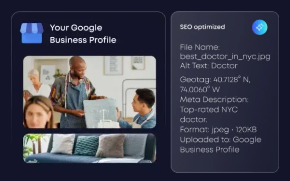 When you upload images to Power Ranker, she optimizes them for your keywords including their file names, meta descriptions, plus geotags them, then she uploads them to your Google Business Profile’s photos section at the optimal moment instead of all at once.