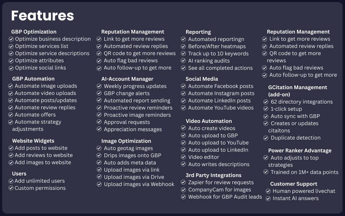 Most local SEO tools only report on your rankings and leave the work to you or your team. Power Ranker is different because she actually does the work for you—automating optimization, posting, image uploads, review replies, and more, based on proven best practices from thousands of profiles. That’s why agencies and SMBs choose Power Ranker when they want a truly “set-and-forget” Google Business Profile solution instead of another dashboard to manage.