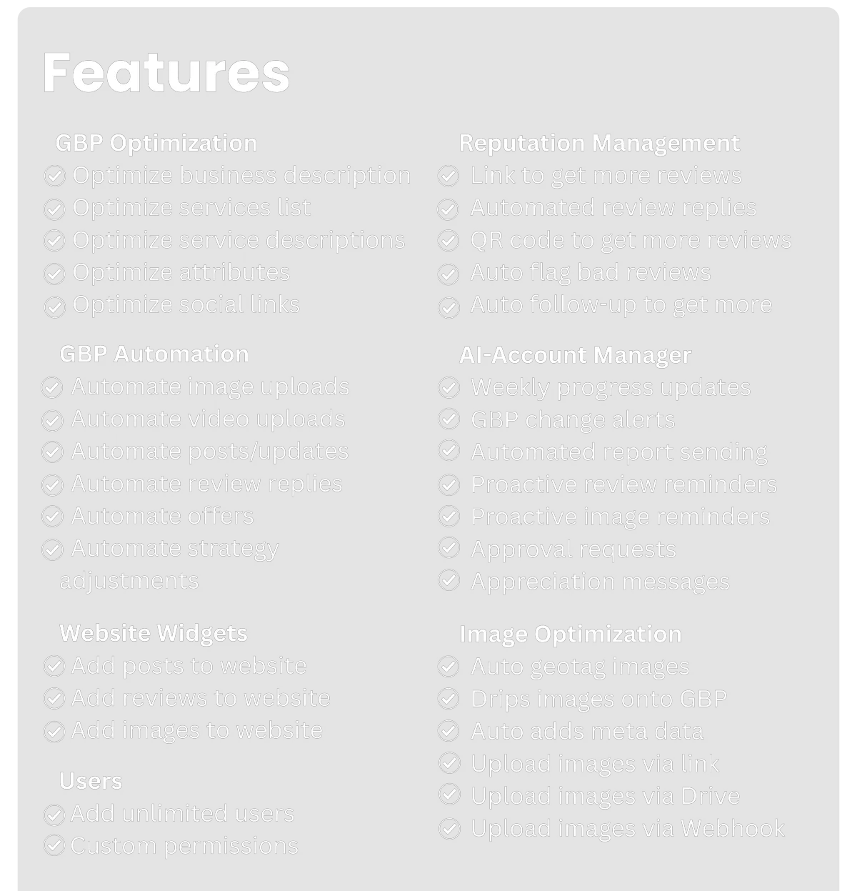 With Power Ranker, you don't need to know anything about local SEO. Power Ranker doesn't just manage your local SEO for you. It learns and improves each month by tracking what she's doing for the thousands of businesses she's managing then seeing what works and what doesn't, then applies the winning strategy to your business. This makes Paige the undisputed best Google Business Profile manager in the world.
