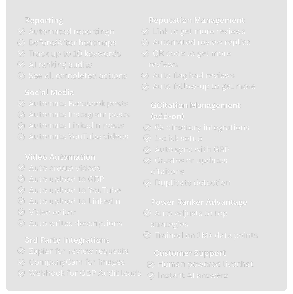 Power Ranker replaces the need for both humans and other marketing software. By including industry leading tools, you can replace your entire tech stack with just Power Ranker, which includes citation management, reputation management, reporting, image optimization, video creation, and more!
